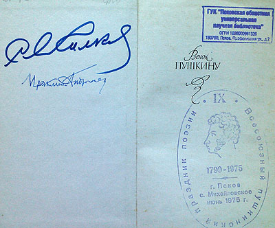 С 1967 года и на протяжении нескольких лет председателем Всесоюзного Пушкинского праздника Поэзии был Ираклий Луарсабович Андроников - писатель, литературовед, мастер устного рассказа. На выставке в Псковской областной библиотеке представлена книга «Венок Пушкину», изданная в 1974 году, на которой рядом со штемпелем IX-го Всесоюзного пушкинского праздника поэзии в 1975 году расписались Ираклий Андроников и Сергей Михалков.